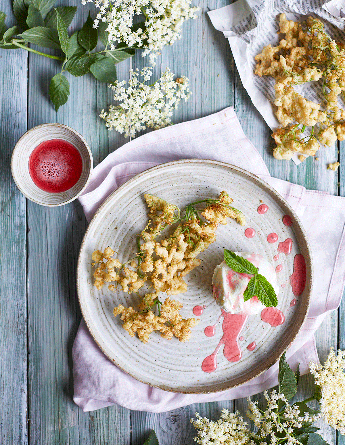 Fläder är riktigt gott och det finns mycket härligt man kan använda dessa aromatiska blommor till förutom den vanliga saften. Idag bjuder vi på vårt recept på friterade fläderblommor som serveras tillsammans med rabarbersirap och vaniljglass!