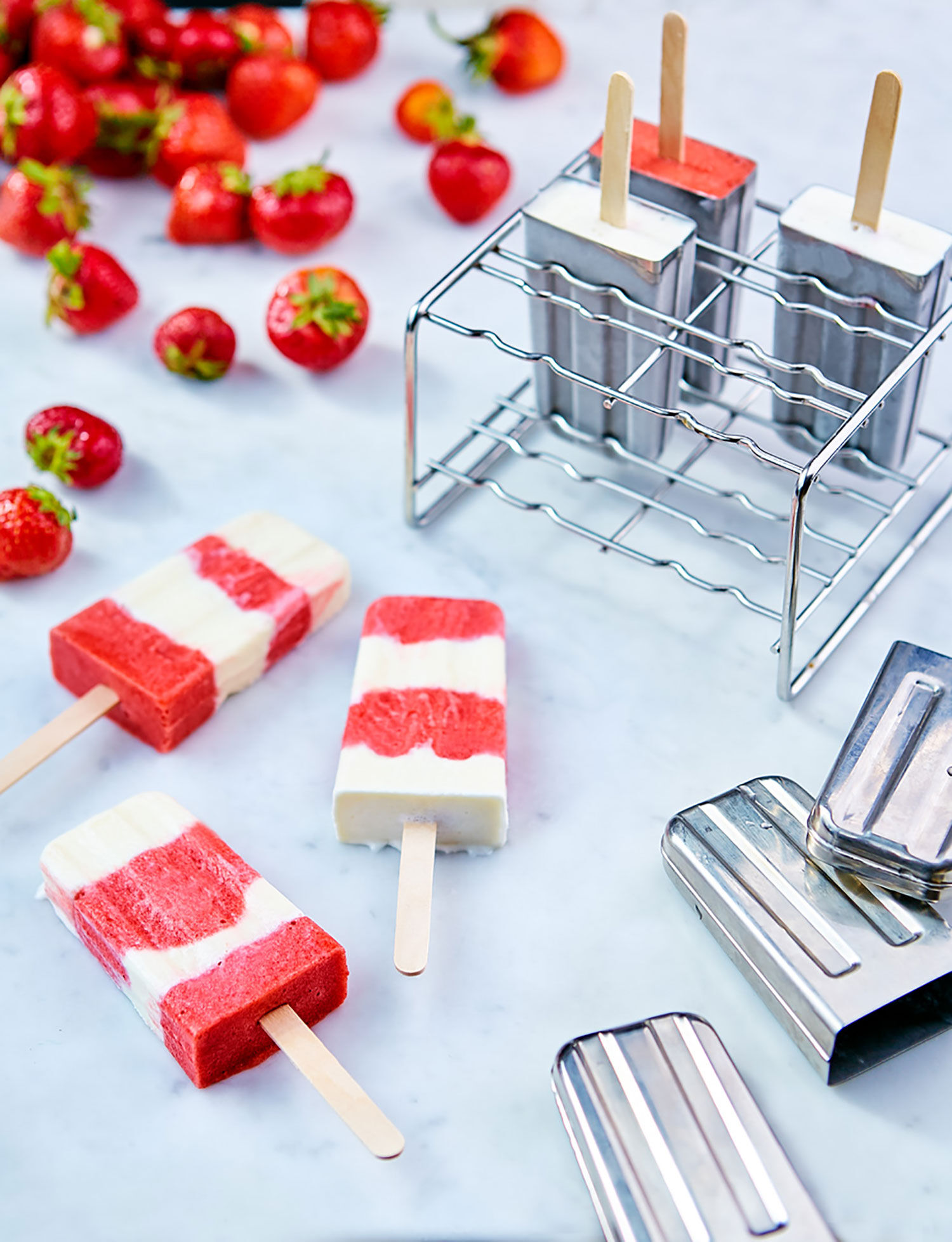En härlig kombination av vaniljyoghurtglass och jordgubbssorbet i glasspinnar. Perfekt för sommardagar!Glasspinneformar finns att köpa i en mängd olika storlekar och utföranden. Vi har använt formar som rymmer ca 1 dl per glass. Bara hälften av den vispade äggvitan används i sorbeten då det är svårt att vispa en mindre mängd.