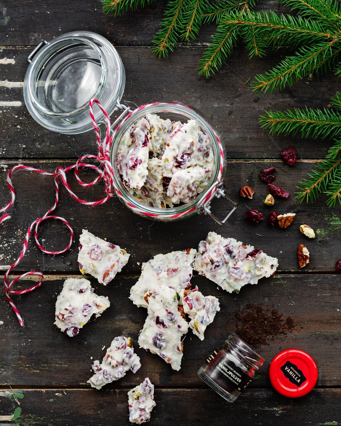 Idag bjuder vi på vitchokladgodis med vanilj, tranbär, kokos och nötter. Vi lovar – detta är ett beroendeframkallande och perfekt sista minuten julgodis som kommer att göra succé hos alla i familjen!