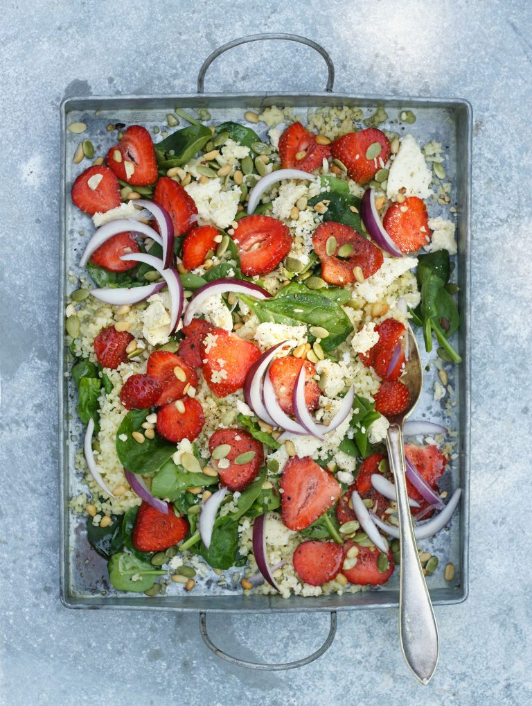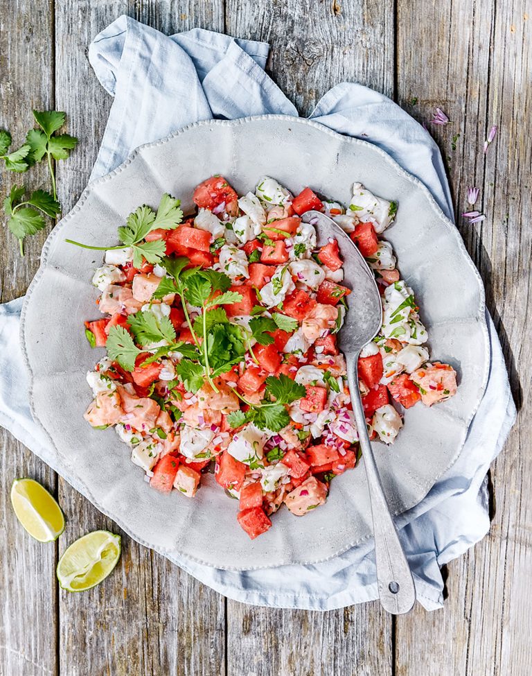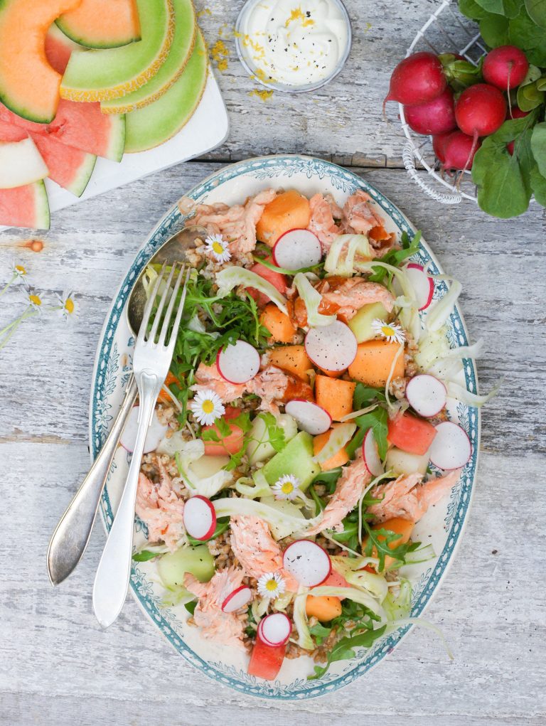 Matig sallad med varmrökt lax, matvete, fänkål, melon och wasabikräm