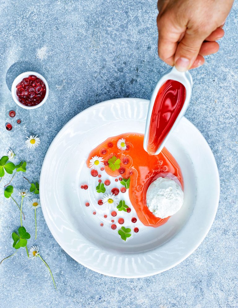 Isad jordgubb- och rabarbersoppa med jordgubbspärlor