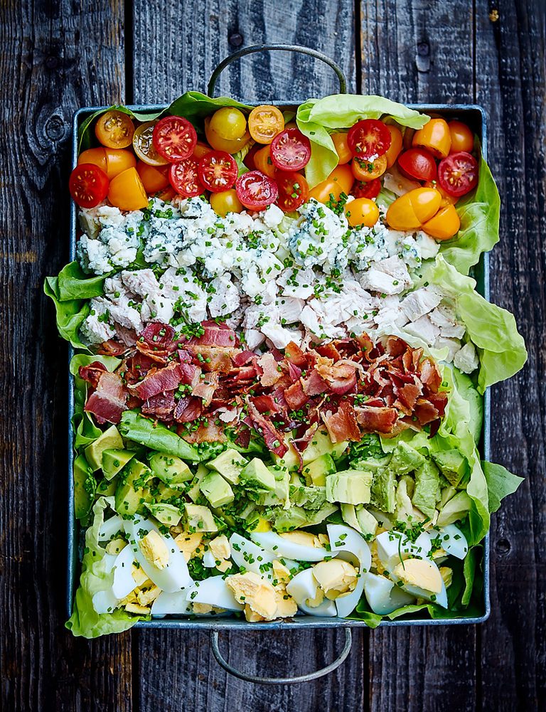 Grillad romansallad med pancetta, örtkrutonger, ägg och Caesardressing
