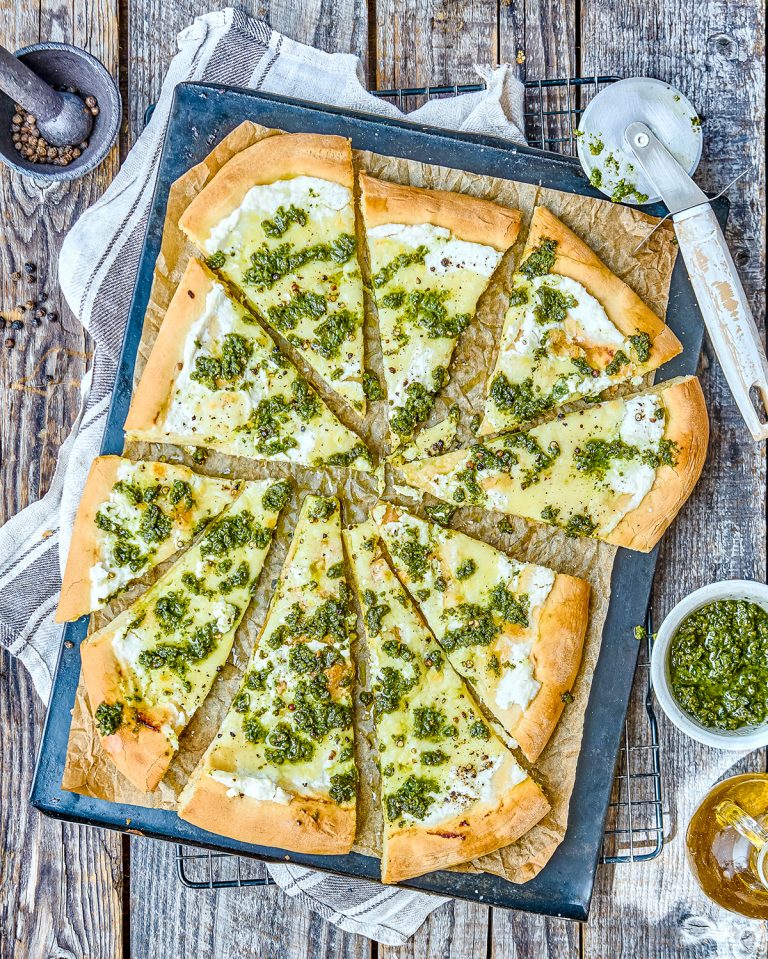 Pizza bianca med ricotta och kirskål- och pistagepesto