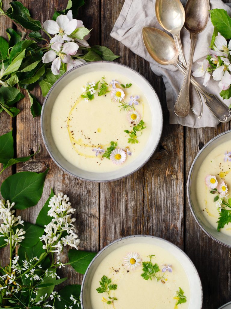 Vit sparrissoppa toppad med färska örter och vårblommor