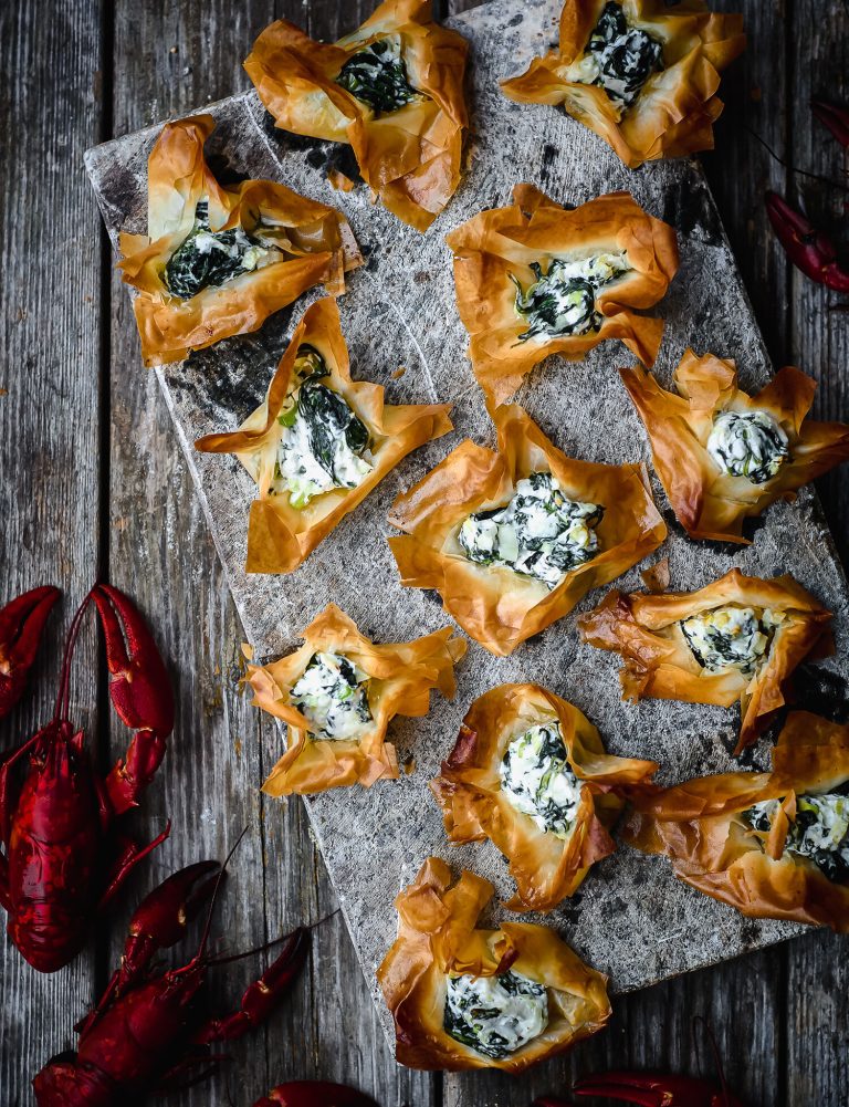 En recept på filodegsknyten med chèvre, spenat och salladslök. Antal: 12 stycken portioner Ingredienser: 120 g färsk spenat en nypa salt 125 g färsk chèvre 2 salladslök 4 ark filodeg ca 75 g smör, smält Gör så: Fräs spenaten i en torr stekpanna tills den mjuknar. Pressa ur vätskan ordentligt. Salta och låt svalna. Smula … Continued