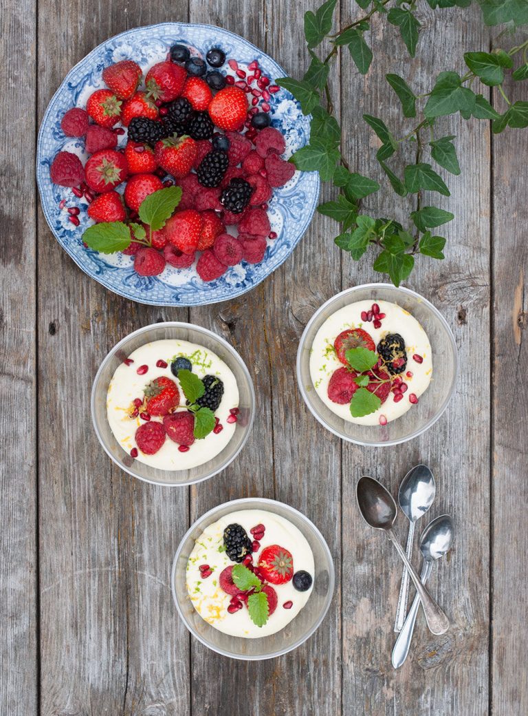 En härlig dessert med en ljuvlig kräm på vit choklad och blandade bär. Antal: 4-6 portioner portioner Ingredienser: 150 g vit choklad 1 ägg 1 äggula 3 msk florsocker 3 dl crème fraiche finrivet skal från ½ citron citronskal 2 dl blandade bär Gör så: Smält chokladen över ett vattenbad. Vispa ihop chokladen med ägget … Continued