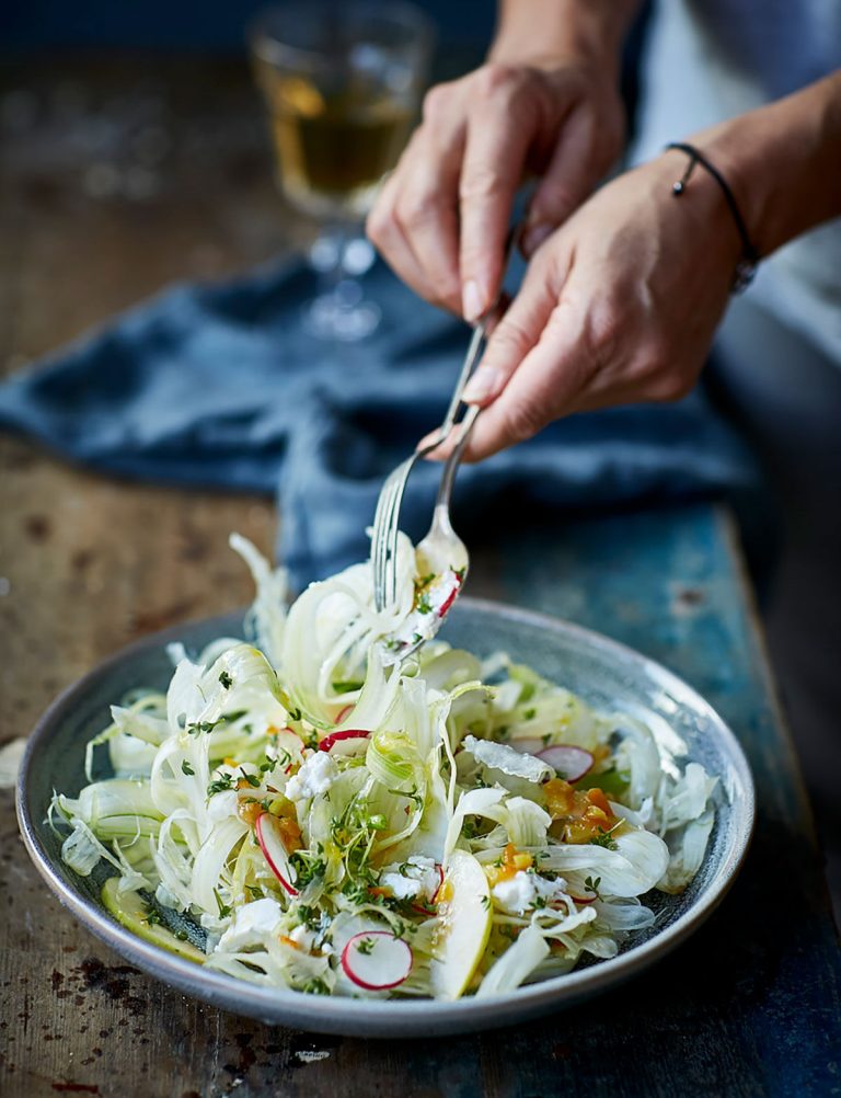 Fänkålsallad med äpple, rädisor, chèvre och apelsinmarmelad-dressing