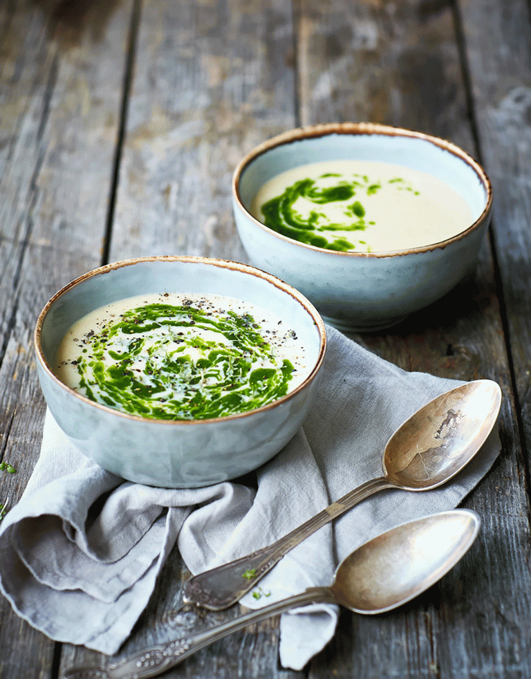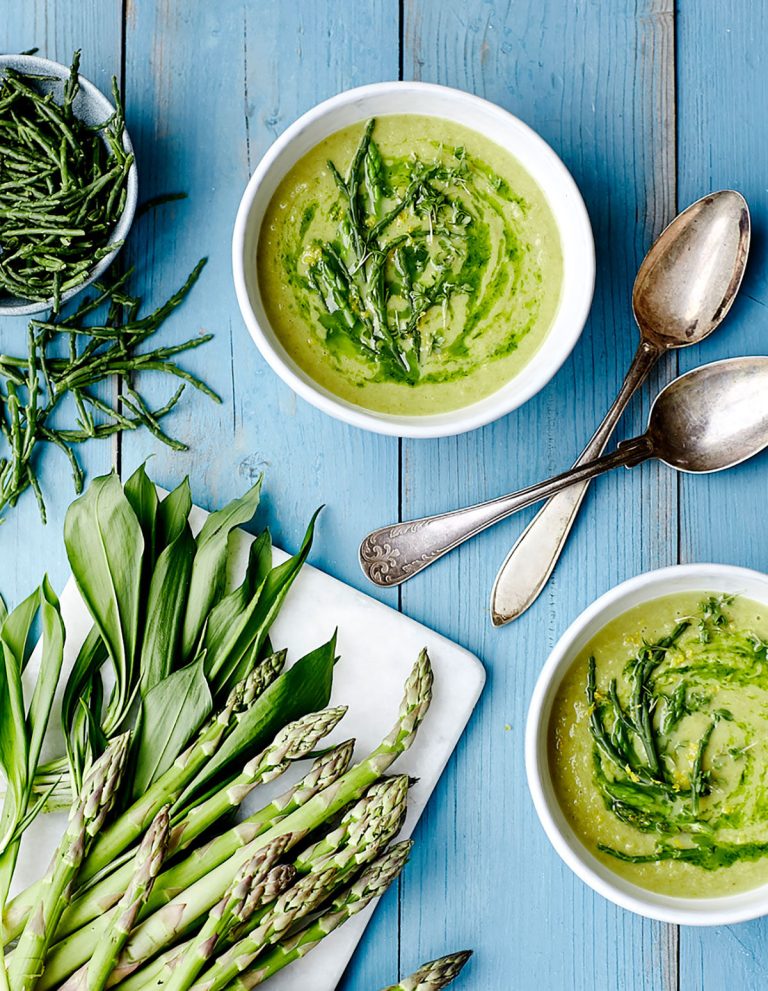 Krämig sparrissoppa med havskorall och ramslöksolja