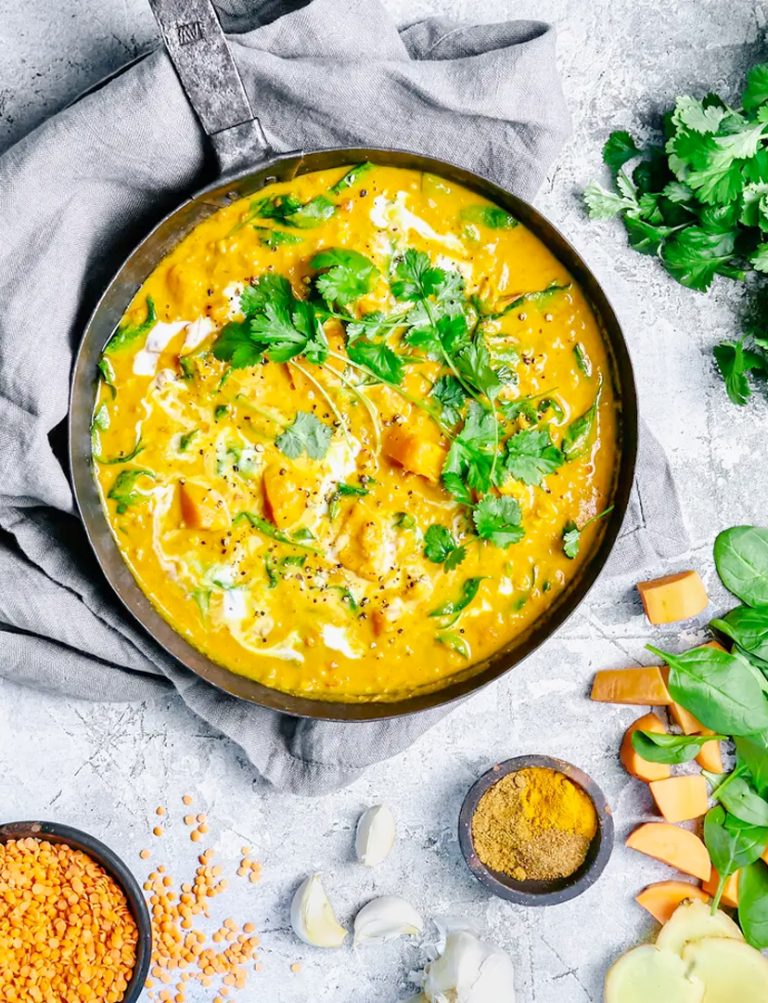 Indisk gryta med röda linser, kokos, sötpotatis och spenat