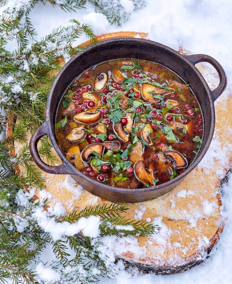 Renskavsgryta med skogschampinjoner och lingon