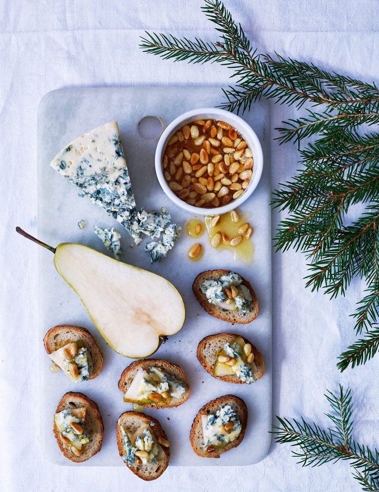 Crostini med rostade pinjenötter i honung med päron och ädelost