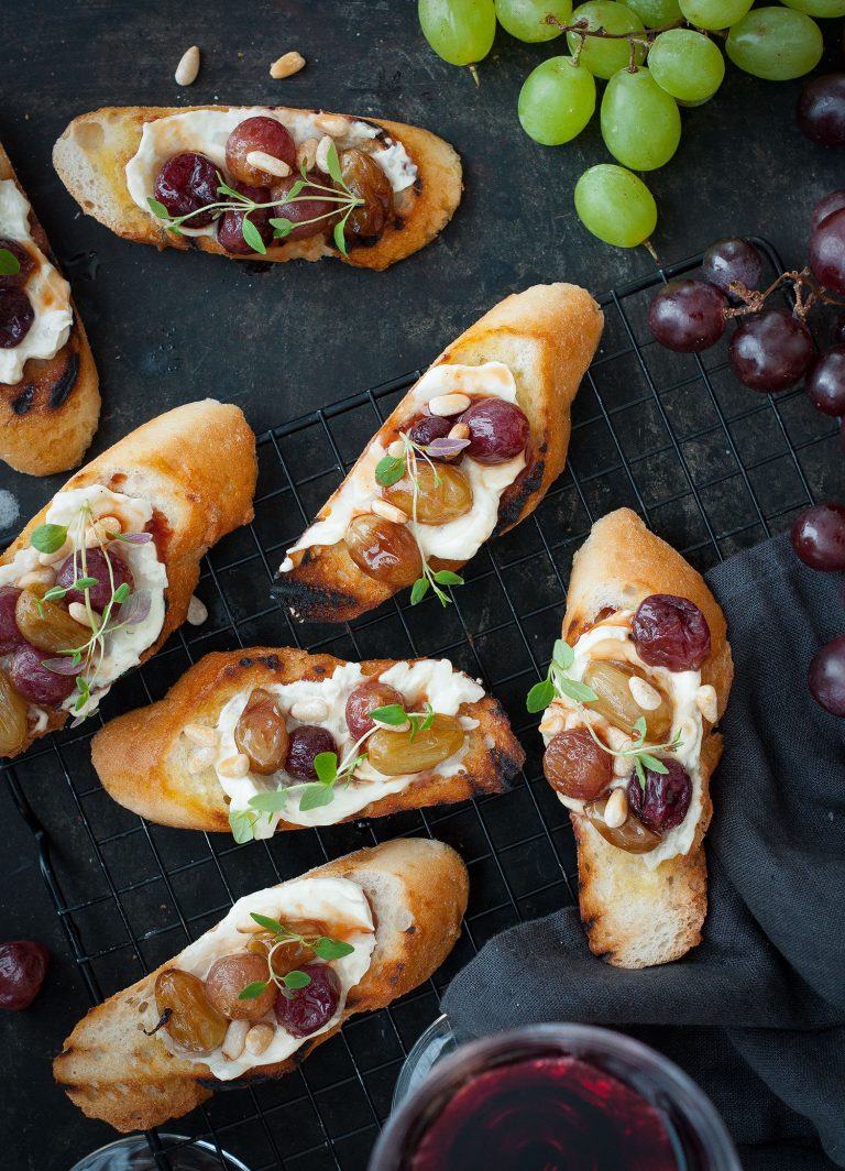 Crostini med karamelliserade vindruvor, chèvre och pinjenötter